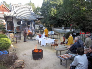甘酒などお接待の後、総代さんや参拝の方々立会いの下境内にて古札の撥遣供養を勤め、感謝の心を込めてお焚き上げを致しました。