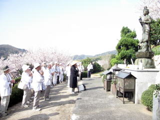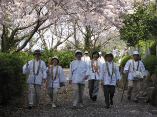 昨年に引き続き、今回は伊予(愛媛県)をお参りしました。宇和島方面ではすっかり葉桜。新緑が始っていましたが、松山・道後に北上するにつれ、満開の桜を眺めながら、また8巡目の団員の結束も深まり、和やかな雰囲気の中、無事にお参りすることができました。お大師さまの足跡を辿り、日々の行いを懺悔しつつ、おかげを戴いていることに感謝して巡ると足取りも軽くなりました。 ぼけ封じ観音参拝 満開の桜をバックに 足取り軽く〜