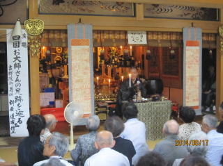はじめに檀信徒さまとともに心経一巻をお唱えし、四つの顔を持つという四国の起こりから、お大師さまの誕生、尊者(とうともの)と呼ばれた幼少期の話から88ヶ所霊場の誕生秘話を身振り手振りを交えながら解り易く説いてくださいました。