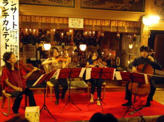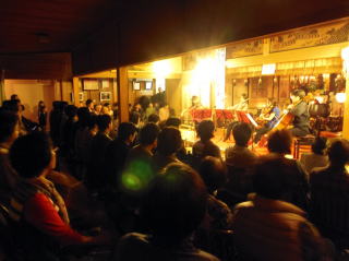 午後7時からご法楽をあげ、お抹茶のお接待を致しました。大悲殿は80名程の方で一杯となり、8時頃からブリランテカルテットの方々4名による奉納コンサート。