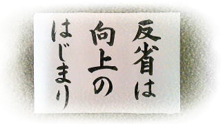 「反省は向上のはじまり」 勤行次第でも「懺悔文」が最初にあり日々の行いの反省から始まります。貪(むさぼり)、瞋(いかり)、痴(ぐち)の心の煩悩にさいなまれて過ちをしてしまいがちな自身の弱さから逃げず、認めて反省し、心の安定をはかるという積極性を促す教えを表しています。
